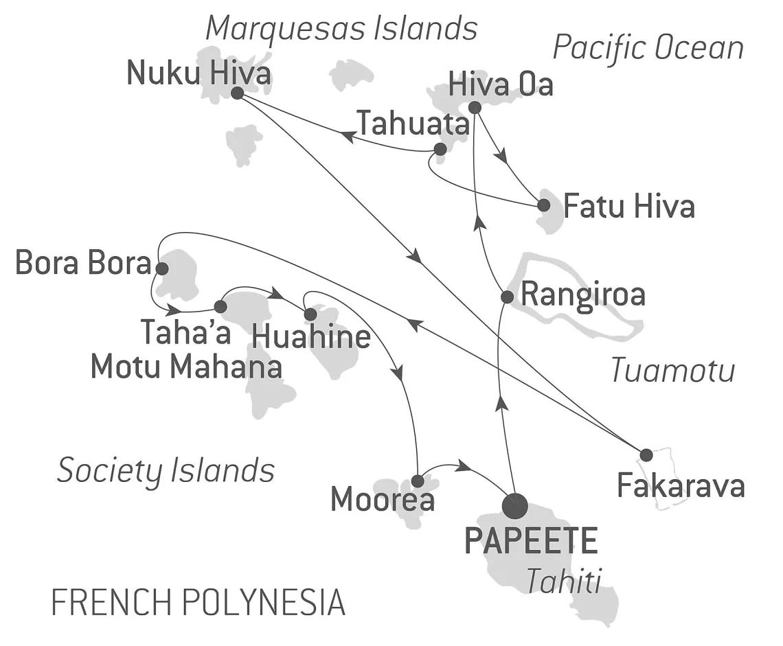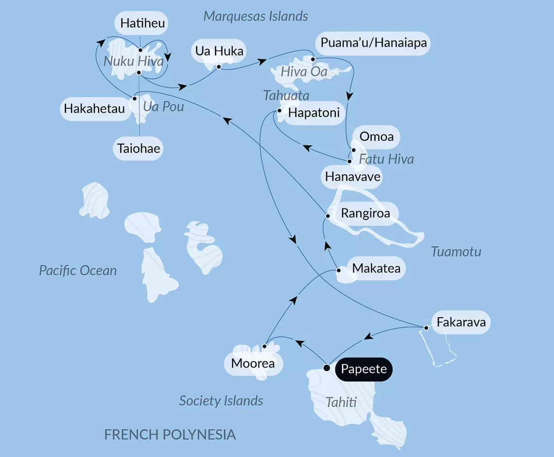 Маршрут круиза: Папеэте, о.Таити - о. Факарава - море - Ханававе, о. Фату-Хива - Омоа, о. Фату-Хива - Атуона, о. Хива-Оа - Хакахау, о. Уа Поу - Тайоа, о. Нуку-Хива - Тайоа, о. Нуку-Хива - море - о. Рангироа - о. Бора-Бора - о. Бора-Бора - о. Хуахине - о. Тахаа - о. Муреа - Папеэте, о.Таити - Папеэте, о.Таити