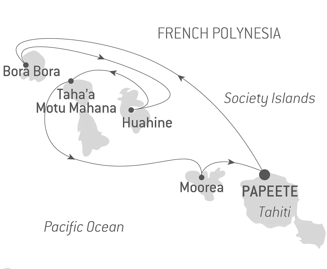 Маршрут круиза: Папеэте, о.Таити - о. Хуахине - о. Райатеа - о. Тахаа - о. Бора-Бора - о. Бора-Бора - о. Муреа - Папеэте, о.Таити - Папеэте, о.Таити