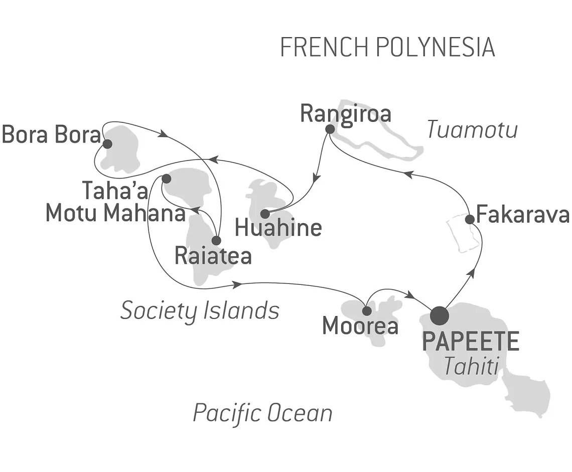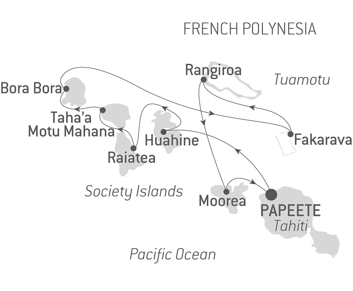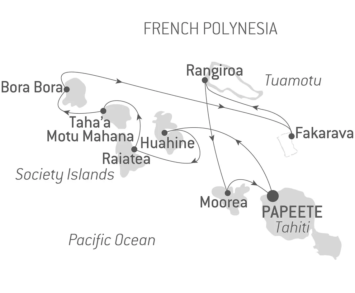 Маршрут круиза: Папеэте, о.Таити - о. Факарава - о. Факарава - о. Рангироа - о. Хуахине - о. Тахаа - о. Бора-Бора - о. Бора-Бора - о. Муреа - о. Муреа - Папеэте, о.Таити - Папеэте, о.Таити