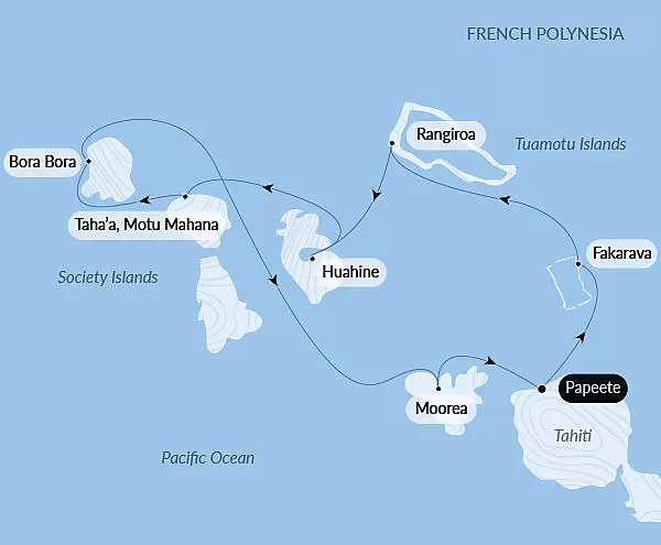 Маршрут круиза: Папеэте, о.Таити - о. Хуахине - о. Райатеа - о. Тахаа - о. Бора-Бора - о. Бора-Бора - море - о. Факарава - о. Рангироа - о. Муреа - о. Муреа - Папеэте, о.Таити - Папеэте, о.Таити