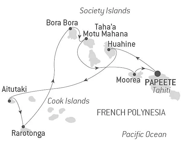 Маршрут круиза: Папеэте, о.Таити - о. Хуахине - море - Атолл Аитутаки - о. Раротонга - море - о. Бора-Бора - о. Бора-Бора - о. Тахаа - о. Муреа - о. Муреа - Папеэте, о.Таити - Папеэте, о.Таити