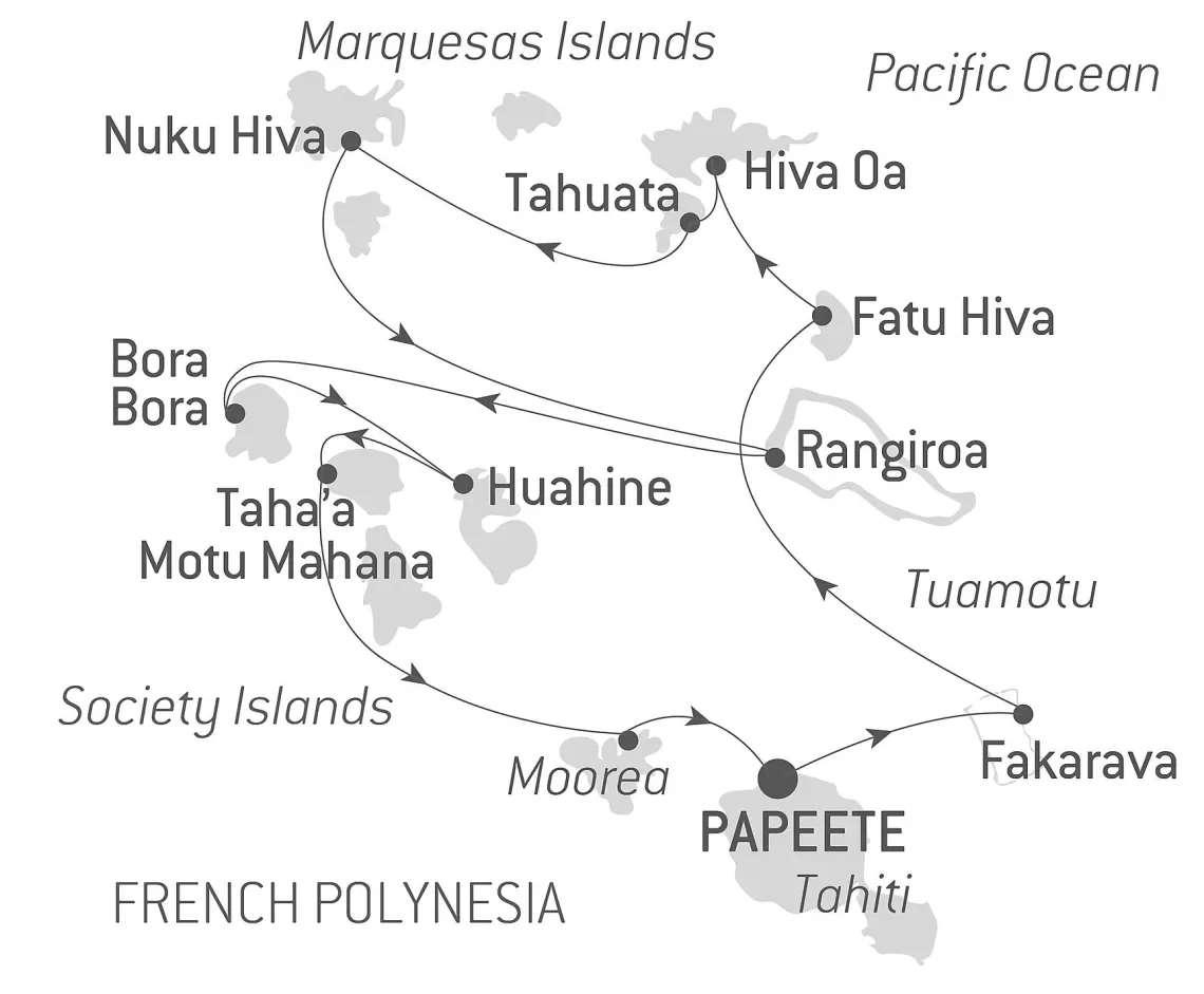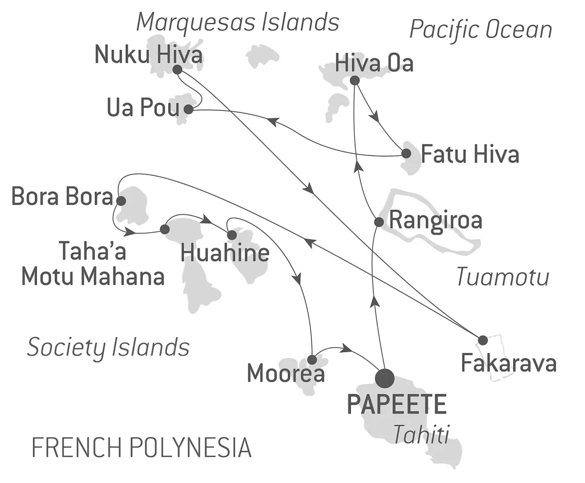 Маршрут круиза: Папеэте, о.Таити - о. Рангироа - море - Атуона, о. Хива-Оа - Омоа, о. Фату-Хива - Хакахау, о. Уа Поу - Тайоа, о. Нуку-Хива - море - о. Факарава - море - о. Бора-Бора - о. Тахаа - о. Хуахине - о. Муреа - Папеэте, о.Таити