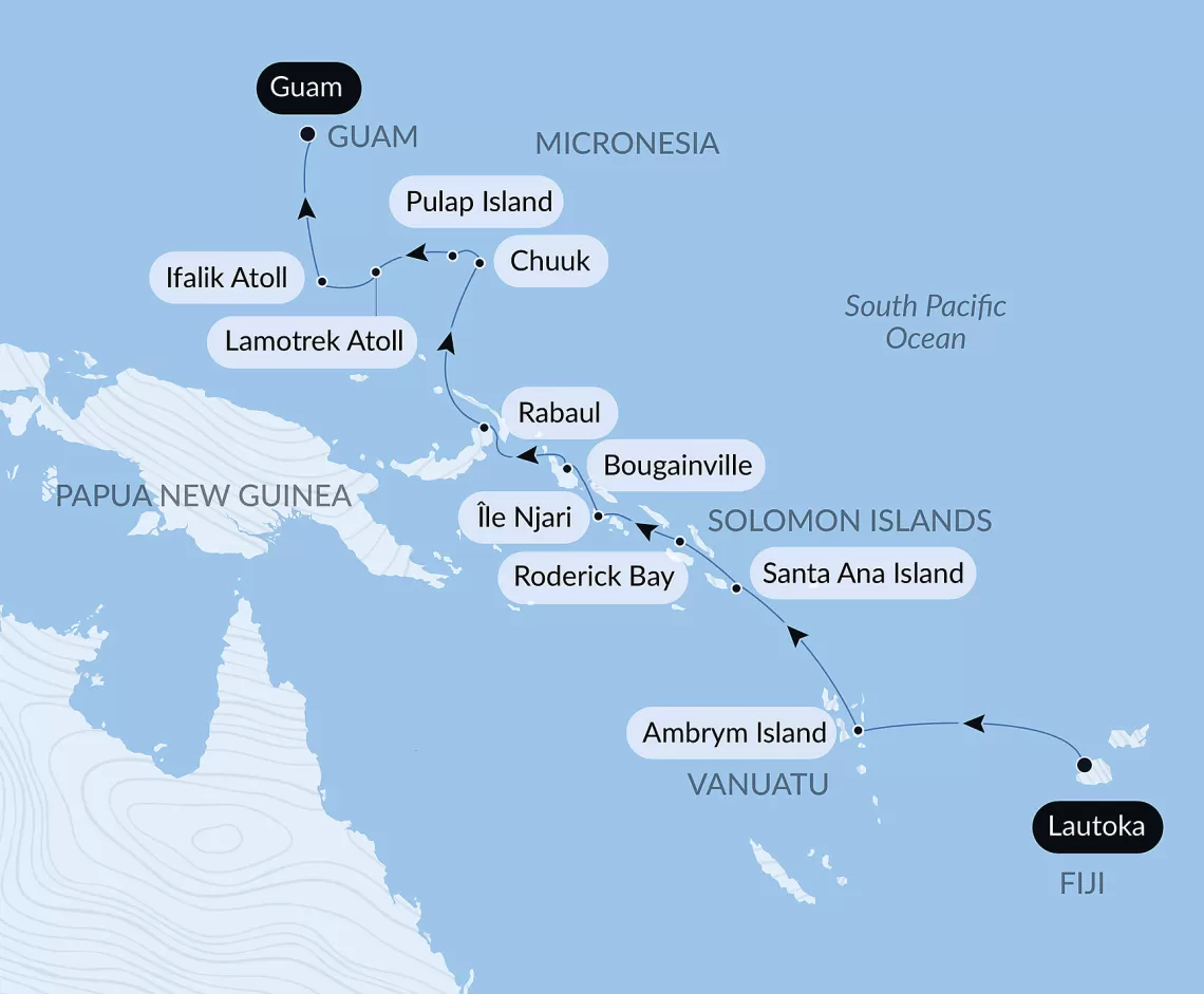 Маршрут круиза: Лаутока, о. Вити-Леву - море - о. Амбрим - море - о. Санта Ана - залив Родерик - о. Нджари - о. Бугенвиль - Рабаул, о. Новая Британия - море - море - о-ва Чуук - Атолл Пулап - атолл Ломатрик - о. Ифалик - море - о. Гуам