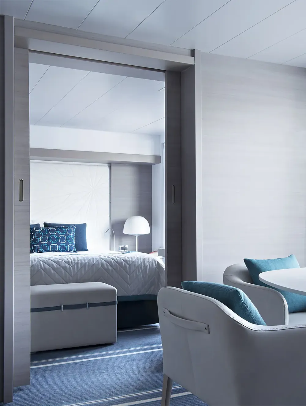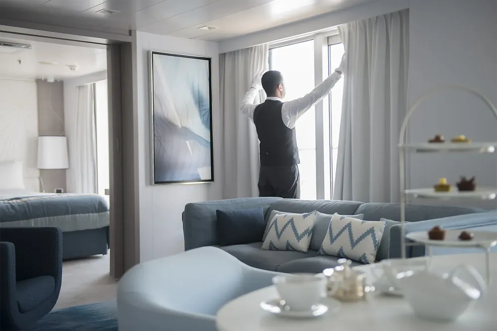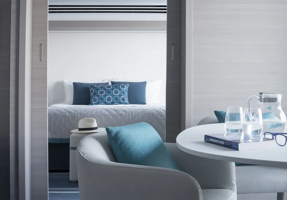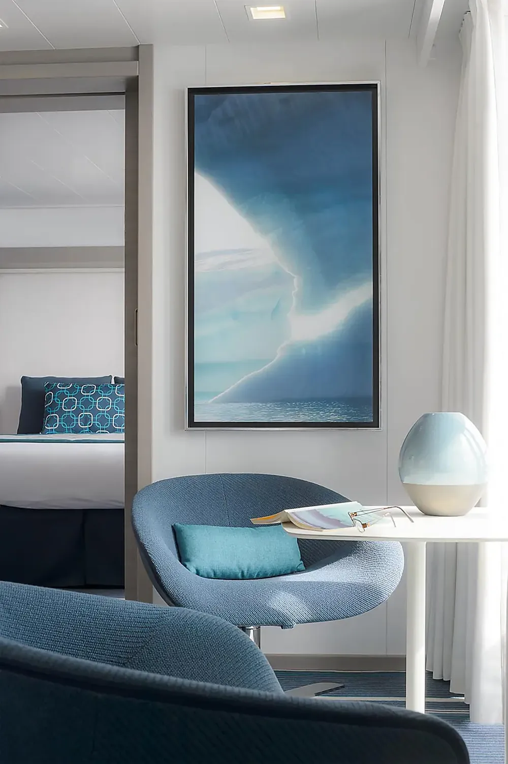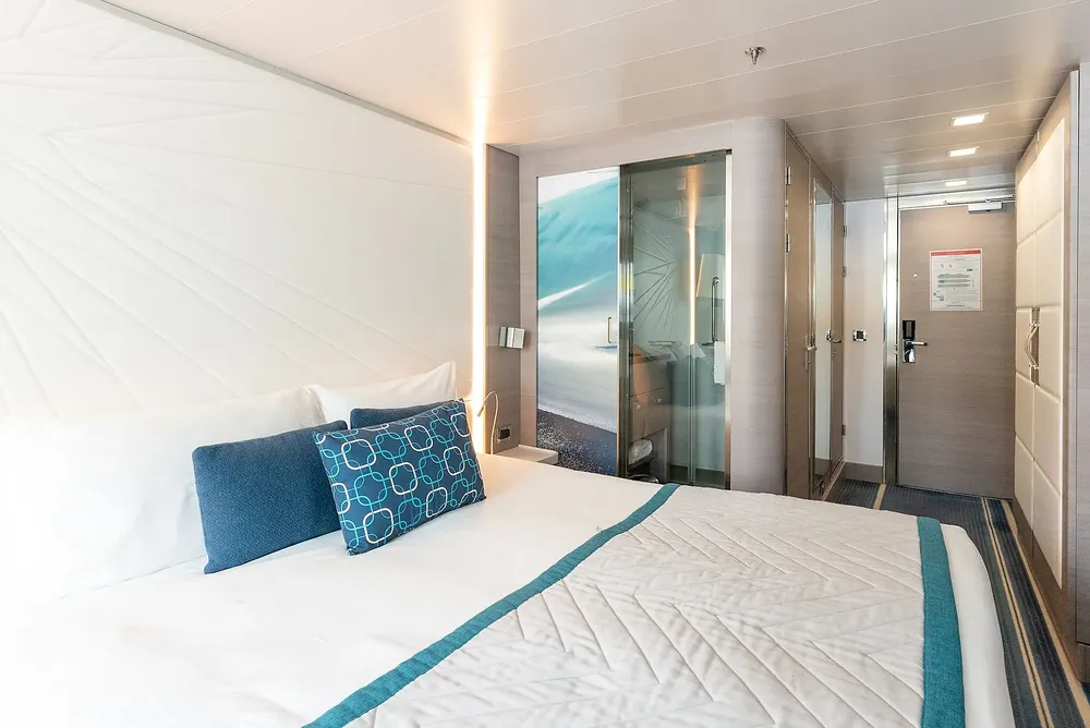 При оформлении интерьера дизайнеры черпали вдохновение из традиций мест будущих круизов, и использовали палитру, состоящую из синих тонов, от мягких, светящихся серых тонов полярных льдов до ярких оттенков бирюзы средиземноморских заливов и бухт.