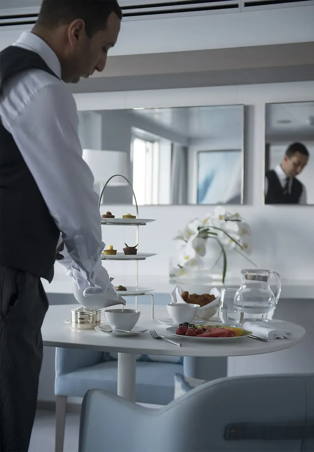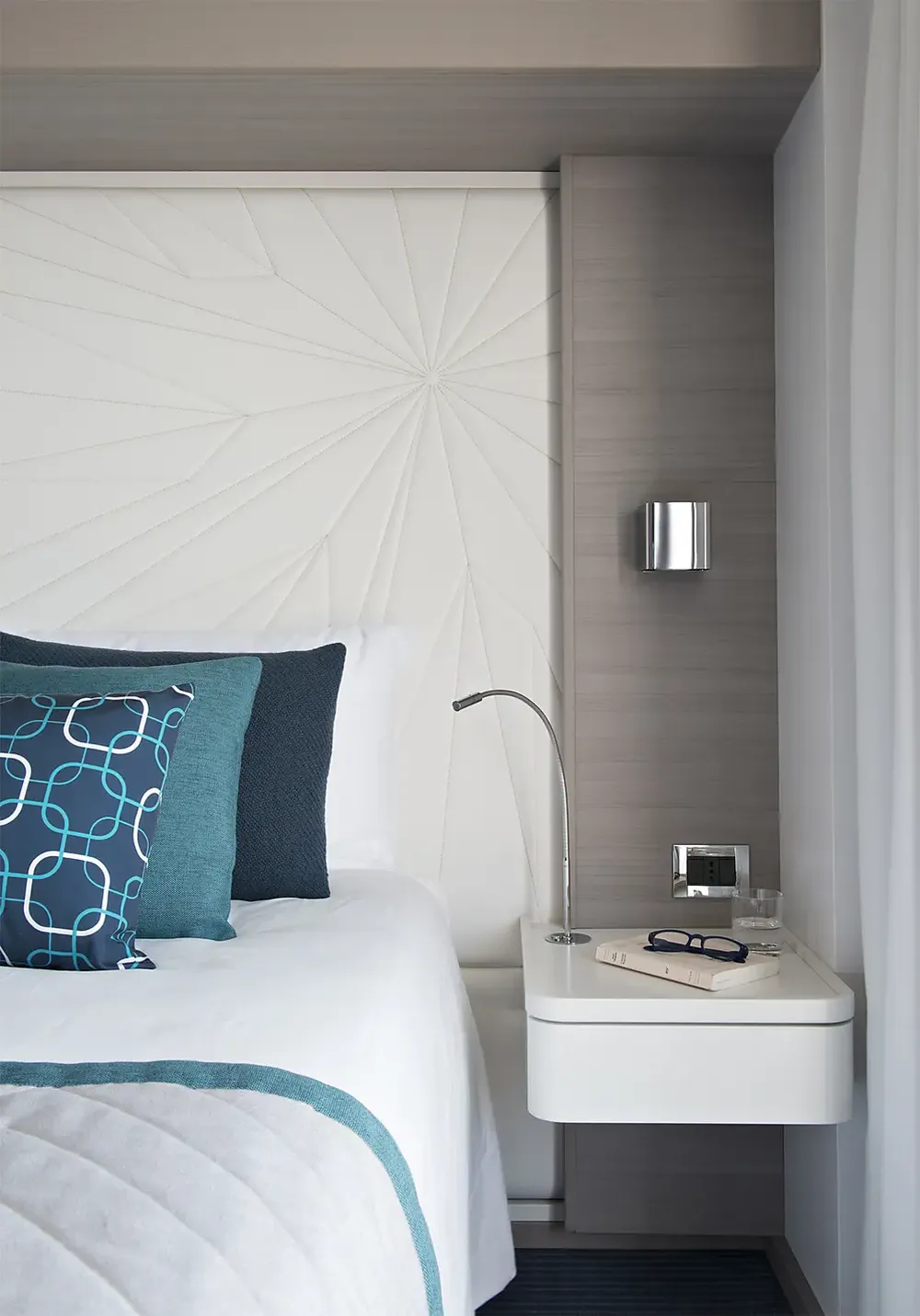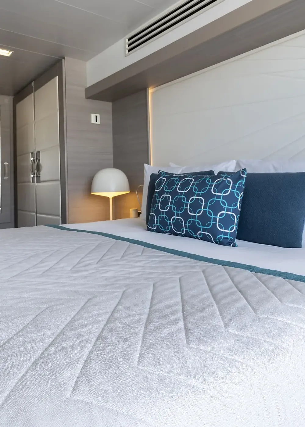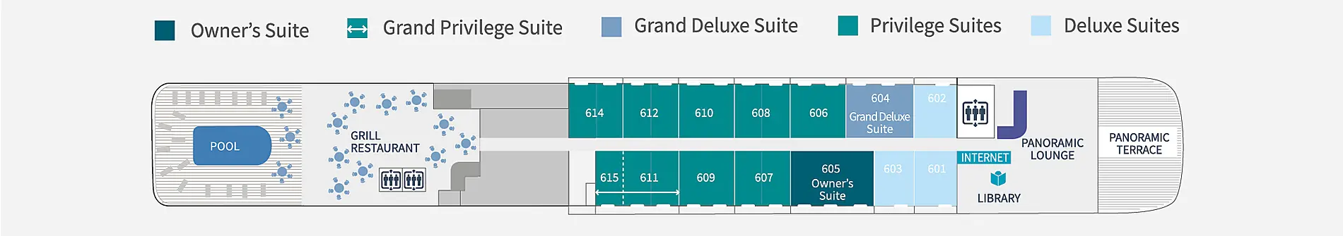 При оформлении интерьера дизайнеры черпали вдохновение из традиций мест будущих круизов, и использовали палитру, состоящую из синих тонов, от мягких, светящихся серых тонов полярных льдов до ярких оттенков бирюзы средиземноморских заливов и бухт.