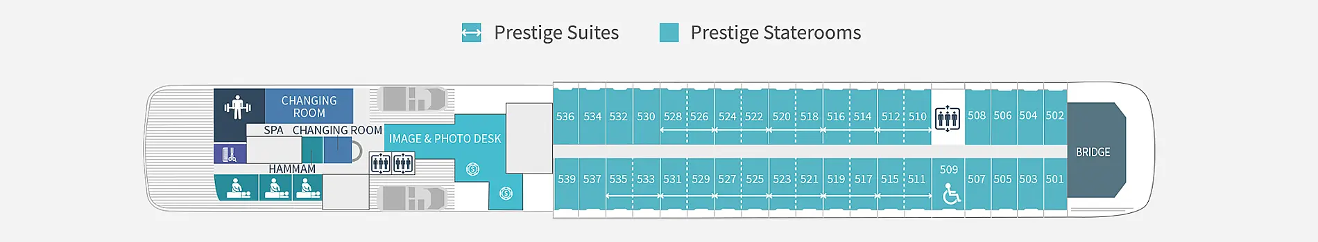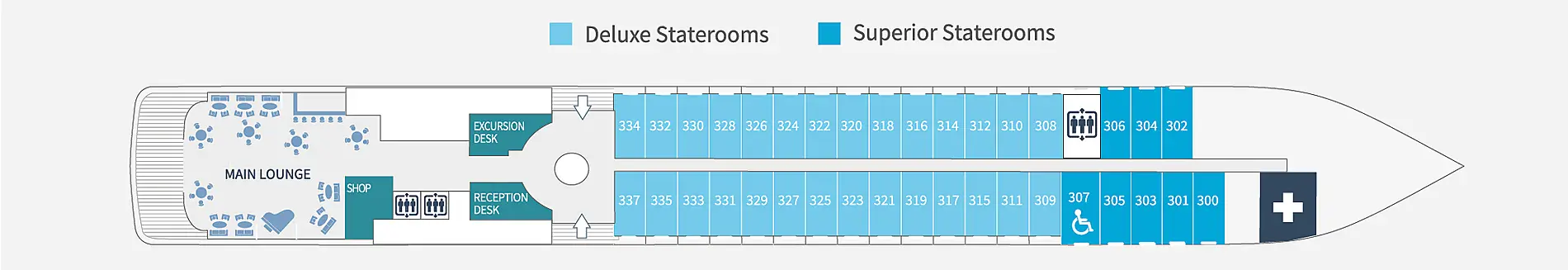 Расположение каюты можно посмотреть на плане палуб во вкладке "Круизный лайнер" на странице выше. Первые цифры номера каюты - номер палубы. Каюты отмеченные "для инвалидов" могут быть заменены MSC на каюту той же категории с другим расположением на лайнере без согласования с Клиентом.