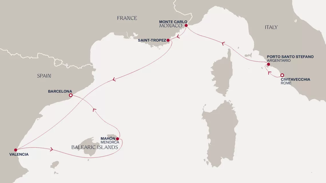 Маршрут круиза: Марсель - море - Малага - Кадиc / Севилья - Лиссабон - море - Аликанте - Маон, о. Менорка - Ольбия, о. Сардиния - Генуя / Милан - Марсель